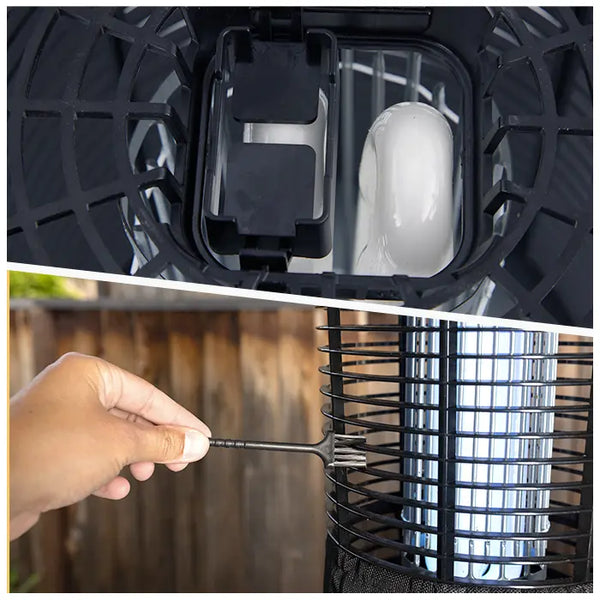 It has a high-density UV light. When insects fly toward the light, they reach the metal grid that emits high voltage (2600V) and are wiped out efficiently without the use of chemicals. It can be used in various scenarios, both indoors and outdoors, although it is more suitable for outdoors due to its size and brightness. It can also be used in all weather conditions and is safe and eco-friendly.