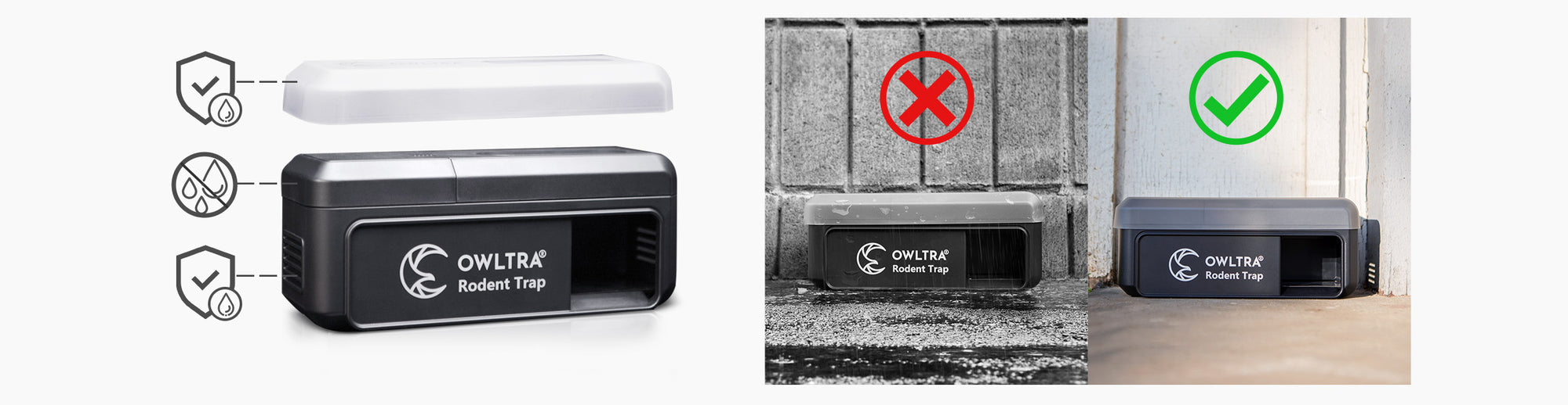 OWLTRA OW-7 In-/Outdoor Electric Rodent Trap can be used outdoors when using together with the waterproof cover that comes with the product. Rodent entrance at the side ensures zero rodent escape and a quick elimination.